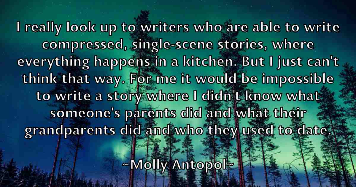 I really look up to writers who are able to write compressed, single-scene stories, where everything happens in a kitchen. But I just can't think that way. For me it would be impossible to write a story where I didn't know what someone's parents did and what their grandparents did and who they used to date.