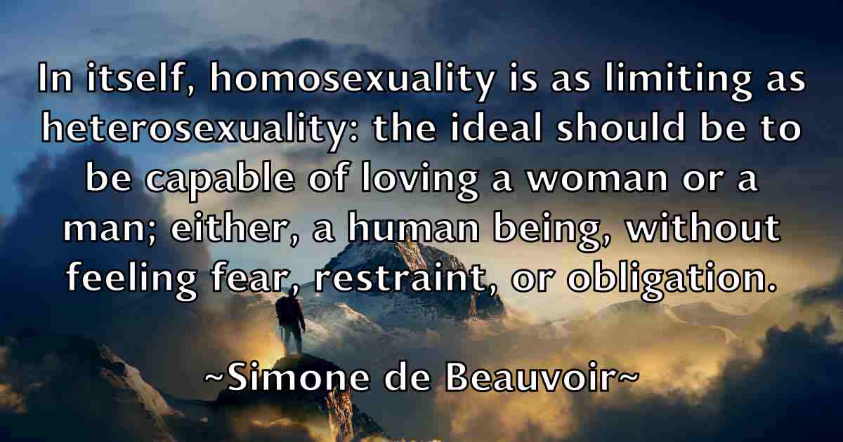 In itself, homosexuality is as limiting as heterosexuality: the ideal should be to be capable of loving a woman or a man; either, a human being, without feeling fear, restraint, or obligation.